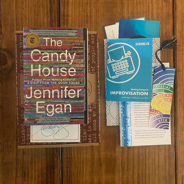 Our April Scribbler Slim featuring Jennifer Egan's Candy House, signed bookplate, writing passport, PPIL, bookmark and chat invite.
