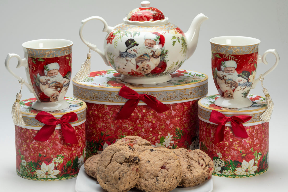 Indulge in the ultimate holiday teatime experience. Celebrate the Season with family and friends while enjoying tea and scones with your brand-new Santa and Friends Tea Set. Make Memories with Every Cup in your porcelain teapot with 2 matching mugs. Each piece is perfectly gift boxed for gifting or storage for years to come. Enjoy 6 freshly baked black forest scones made with chocolate and cherries that compliment your canister of specially blended black forest tea. Our made from scratch scones- Scones are Freshly Baked and Individually Wrapped