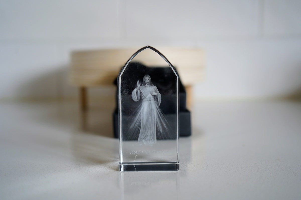 Elevate your sacred space with this captivating Divine Mercy masterpiece, where faith and craftsmanship intersect in translucent splendor.