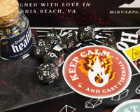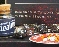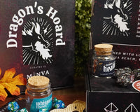 - Includes a Glass Corked Bottle with a Custom Label and a set of 7 mystery TTRPG Dice