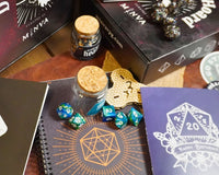 This box contains a record of adventure campaign journal, a premium bookmark, a holographic mystery potion dice bottle, 2 stickers, one pin, one keychain, custom dnd birthday card, and more!