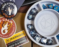 Our dice roller box contains a dice tray, birthday card, mini 5e character sheets (x5), mystery potion dice bottle, stickers, and more!