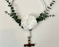 10" Farmhouse White Wall Rosary with Wooden Crucifix, Blue Accents and Artificial Rose