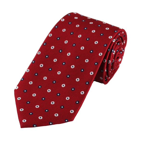 Ruby Illusions Tie: Elevate your professional style with this striking red tie featuring a cross pattern in white and blue. Perfect for the office or date night, this statement piece will captivate all eyes.