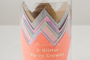 Party in style with these glittery mini party crowns! Bright colors and shimmering glitter details make these elastic crowns (3.375 x 3 inches, 8 pack) a delightful addition to any celebration.