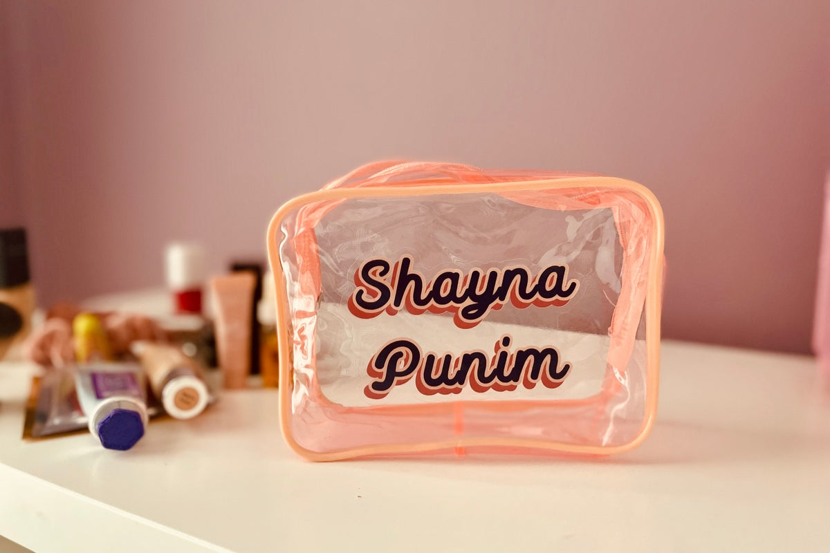 Schmaltzy Box's sleek, functional Shayna Punim clear makeup bag for hassle-free travel.