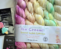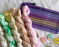 This lovely gift set features five Sport Weight Baby Alpaca Mini Skeins, Themed Stitch Marker, Ice Cream Cone Silicone Knitting Stitch Stoppers and a colorful zip pouch. This cheerful set makes a great gift for any yarn enthusiast.- Hand Dyed Yarn