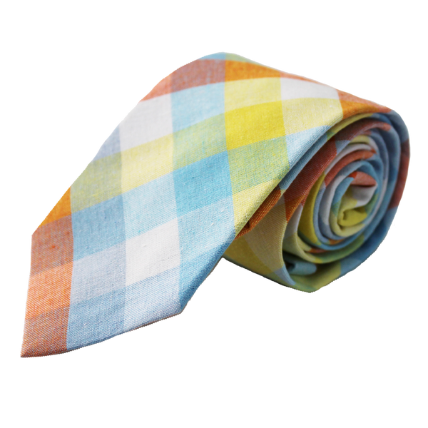 Sunshine Cotton TieDazzle in this vibrant cotton tie, featuring a playful pattern of yellow, orange, light blue, and white. Perfect for both casual and formal occasions, it pairs beautifully with a dress shirt or adds a bold touch to a blazer ensemble. Make a statement and brighten up your wardrobe with this eye-catching accessory.