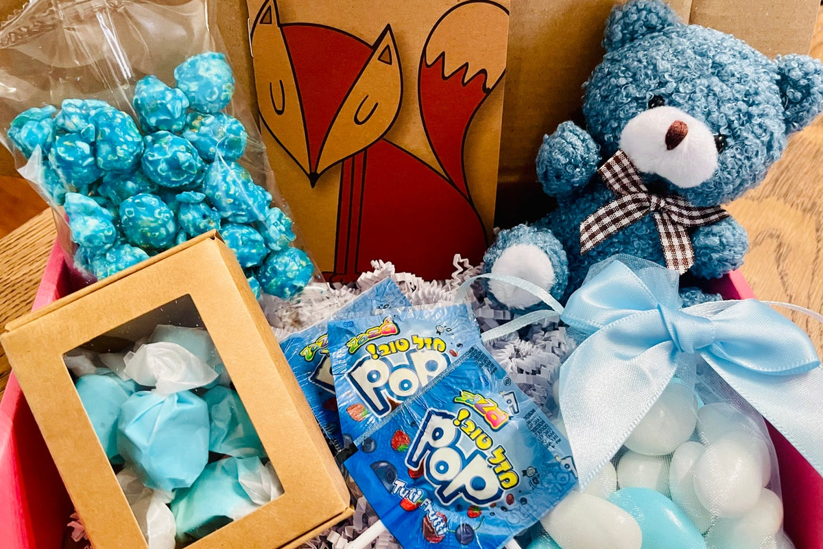 Sweet Baby Gift Box - BoyCelebrate a precious new arrival with our beautifully curated gift box! Filled with kosher-certified treats like Jordan almonds, saltwater taffy, lollipops, and candy-coated popcorn. A sweet little blue teddy bear completes this delightful assortment, perfect for congratulating proud parents and welcoming their bundle of joy.