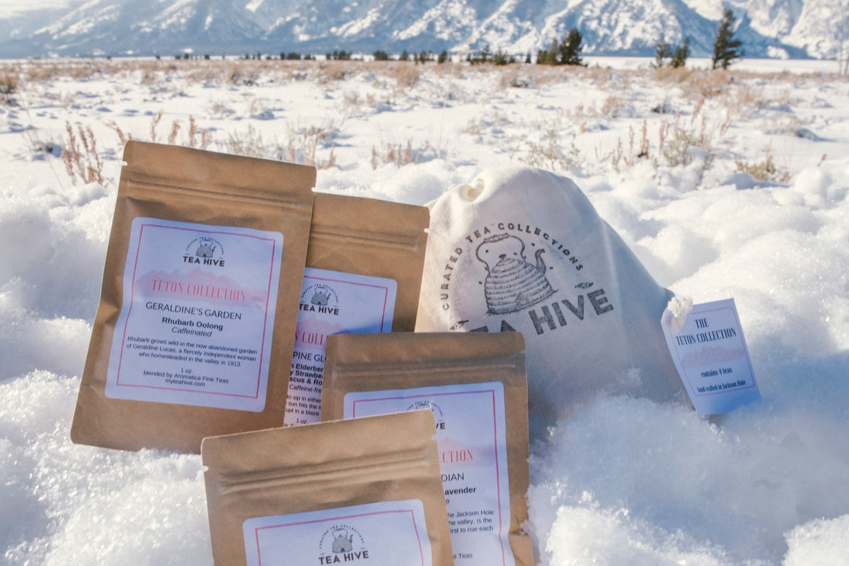 Four 1-oz bags of herbal/black teas inspired by Jackson Hole: berry, sage black tea, spearmint lavender, and rhubarb oolong blends. A taste of the Tetons in every sip.