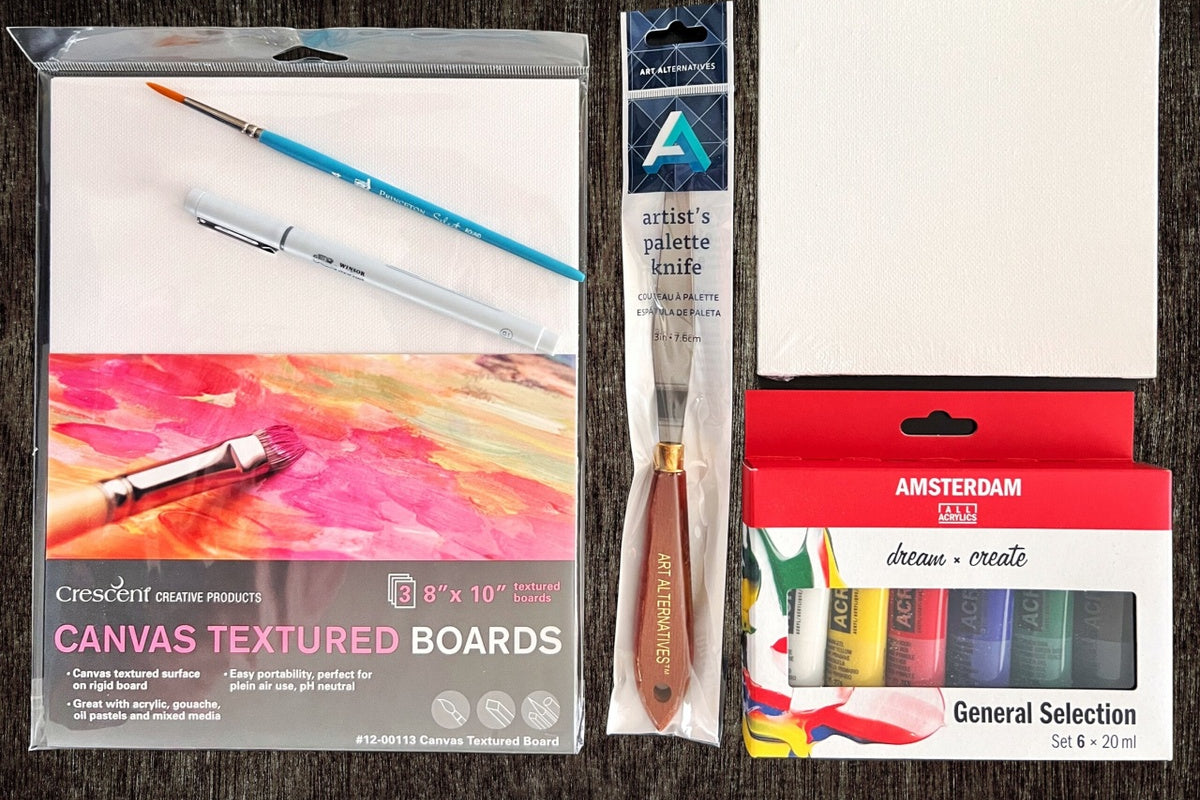 Amsterdam Standard Series Acrylics General Selection Set 6 × 20 ml, Winsor Newton Fineliners, Artist Brush 6 Round, Artist Palette Knife, Art Alternatives Canvas Board - 6" x 6", and Crescent Canvas Textured Boards 3pk - 8" x 10"More from Paletteful Packs